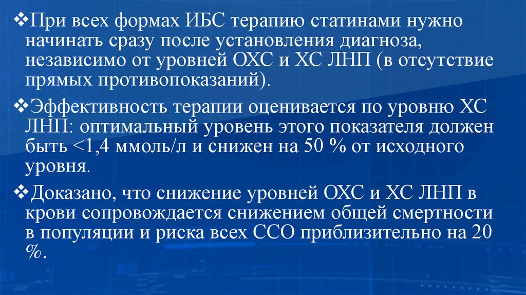 При всех формах ИБС терапию статинами нужноначинать сразу после установления диагноза,