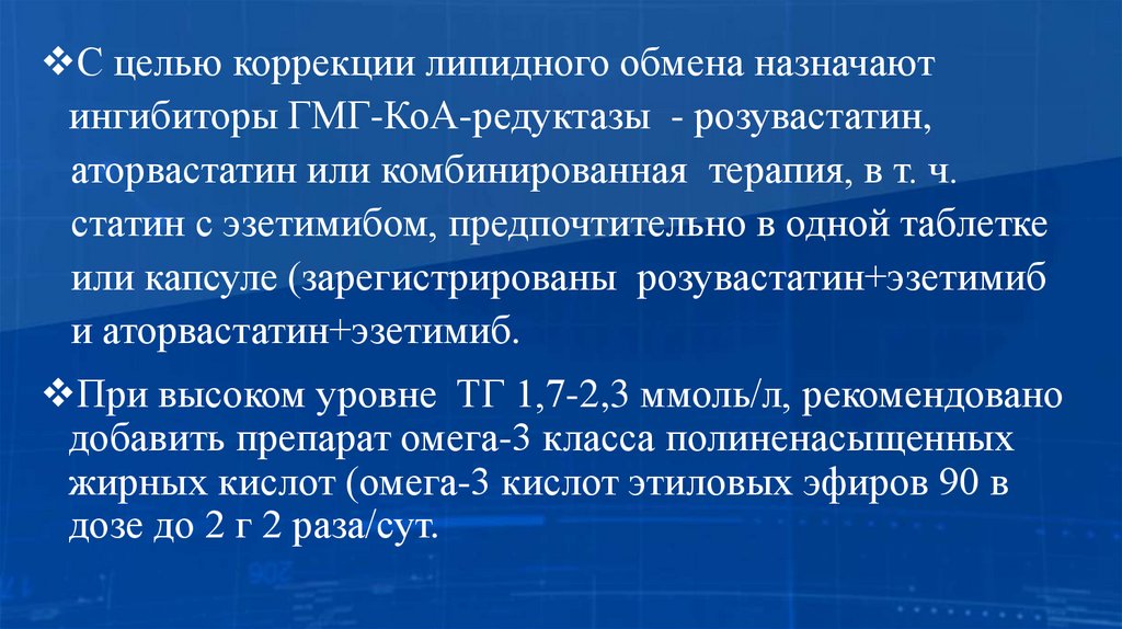 С целью коррекции липидного обмена назначаютингибиторы ГМГ-КоА-редуктазы - розувастатин,