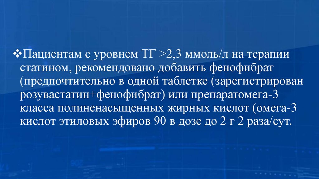 Пациентам с уровнем ТГ >2,3 ммоль/л на терапиистатином, рекомендовано добавить фенофибрат