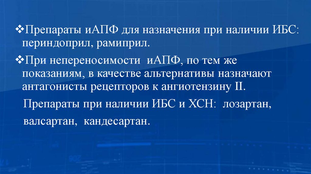 Препараты иАПФ для назначения при наличии ИБС:периндоприл, рамиприл.
