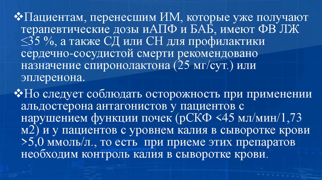 Пациентам, перенесшим ИМ, которые уже получаюттерапевтические дозы иАПФ и БАБ, имеют ФВ ЛЖ