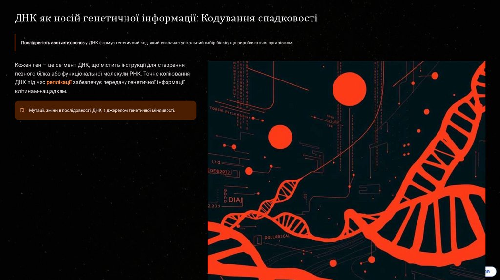 ДНК як носій генетичної інформації: Кодування спадковостіПослідовність азотистих основ у ДНК формує генетичний код, який визначає унікальний набір білків, що виробляються організмом.