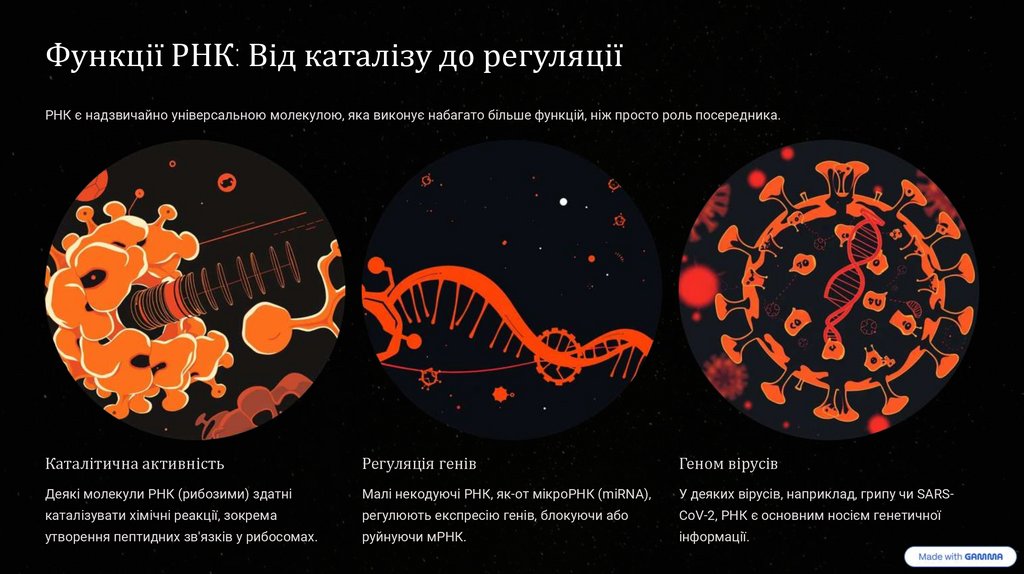 Функції РНК: Від каталізу до регуляціїРНК є надзвичайно універсальною молекулою, яка виконує набагато більше функцій, ніж просто роль посередника.