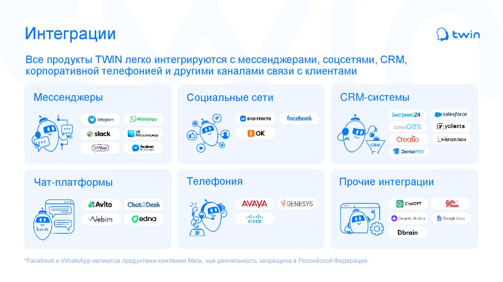 ИнтеграцииВсе продукты TWIN легко интегрируются с мессенджерами, соцсетями, CRM,