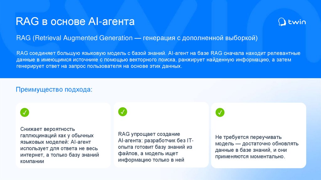 RAG соединяет большую языковую модель с базой знаний. AI-агент на базе RAG сначала находит релевантные