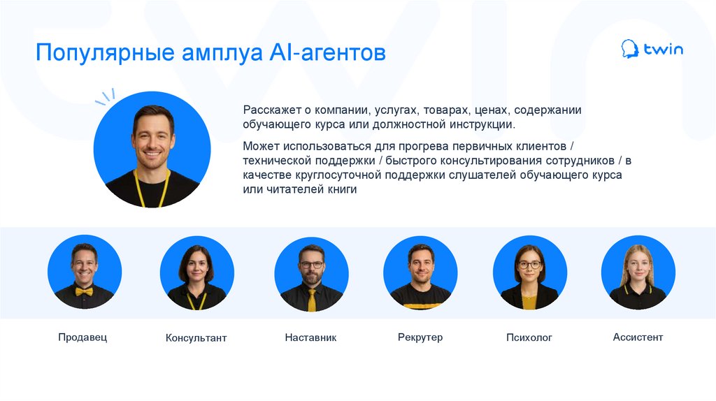 Популярные амплуа AI-агентовРасскажет о компании, услугах, товарах, ценах, содержании