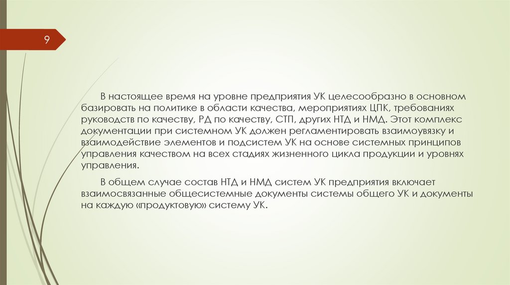 В общем случае состав НТД и НМД систем УК предприятия включает