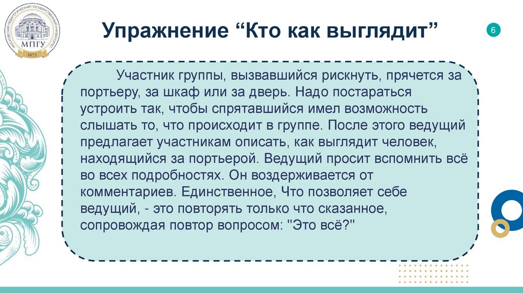 Упражнение “Кто как выглядит”Участник группы, вызвавшийся рискнуть, прячется за