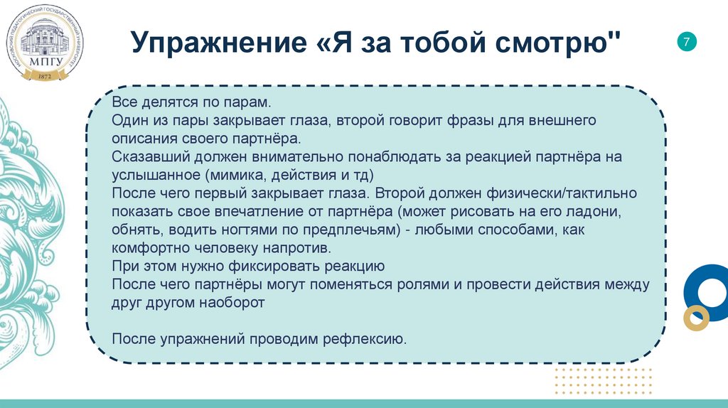 Упражнение «Я за тобой смотрю"Все делятся по парам.