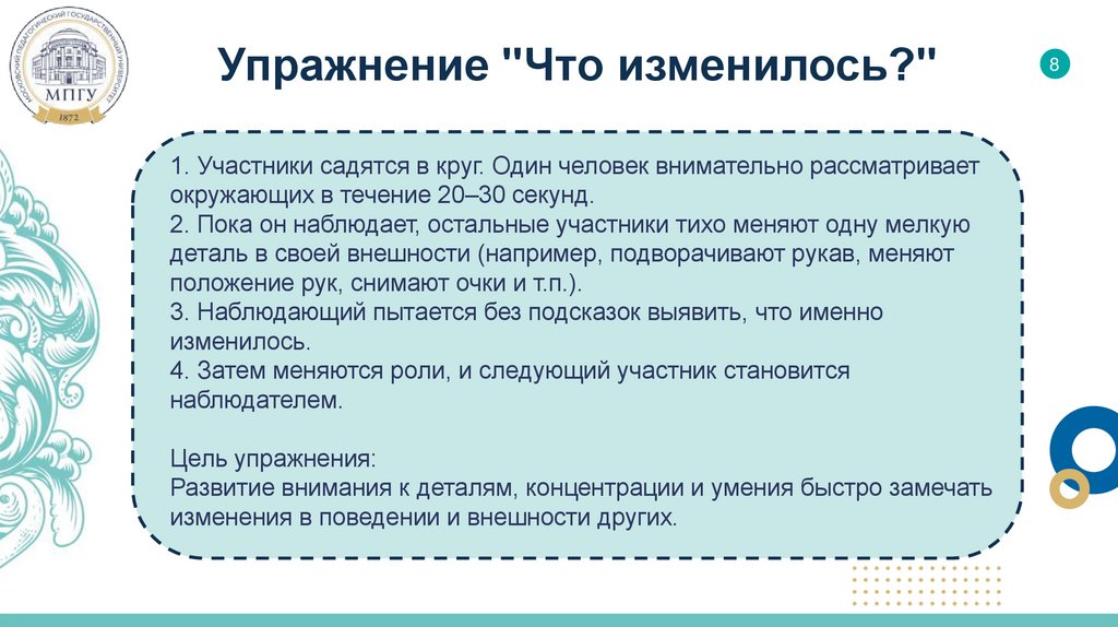 Упражнение "Что изменилось?"1. Участники садятся в круг. Один человек внимательно рассматривает