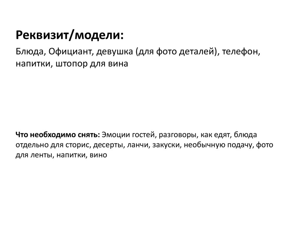 Что необходимо снять: Эмоции гостей, разговоры, как едят, блюда