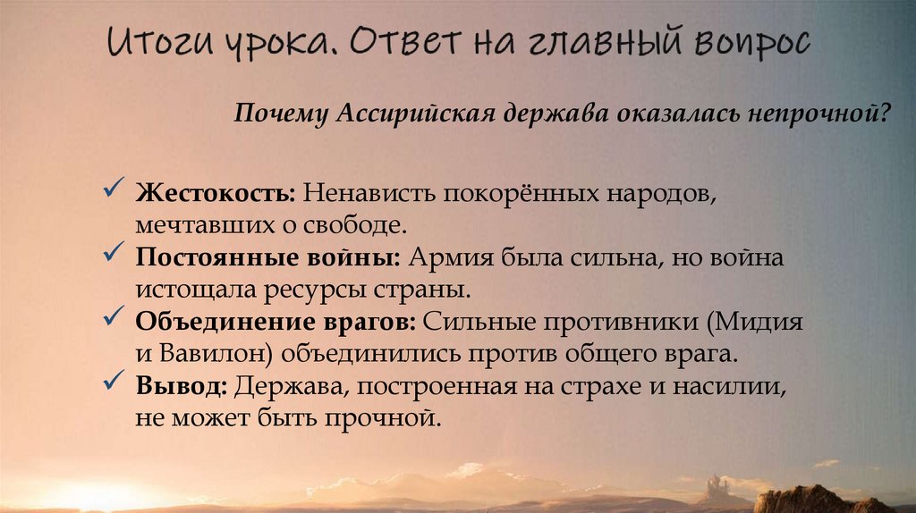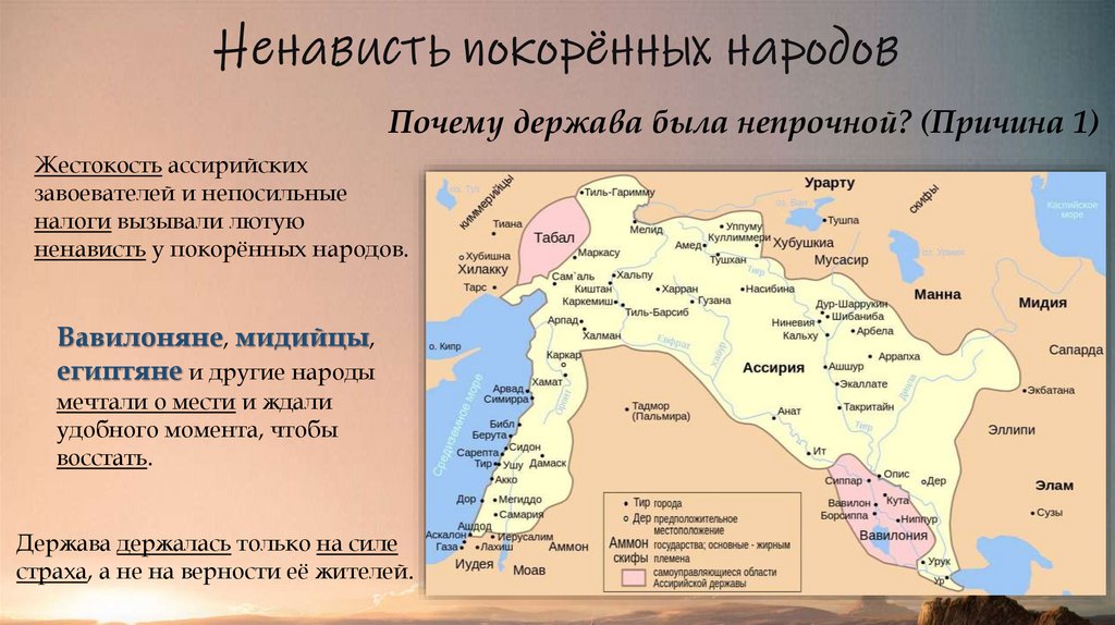 Почему Ассирийская держава оказалась непрочной?Жестокость: Ненависть покорённых народов,