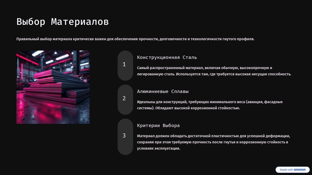 Выбор МатериаловПравильный выбор материала критически важен для обеспечения прочности, долговечности и технологичности гнутого профиля.