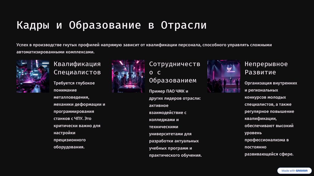 Кадры и Образование в ОтраслиУспех в производстве гнутых профилей напрямую зависит от квалификации персонала, способного управлять сложными