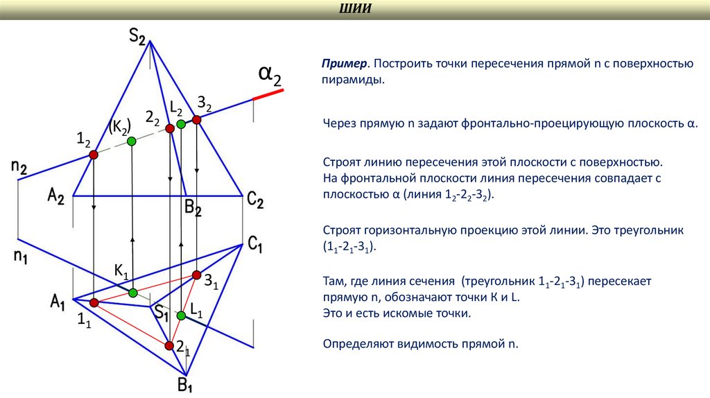 - точки пересечения заданной прямой и построенной линии пересечения будут искомыми
