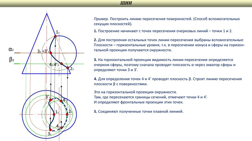 ШИИПример. Построить линию пересечения поверхностей. (Способ вспомогательных