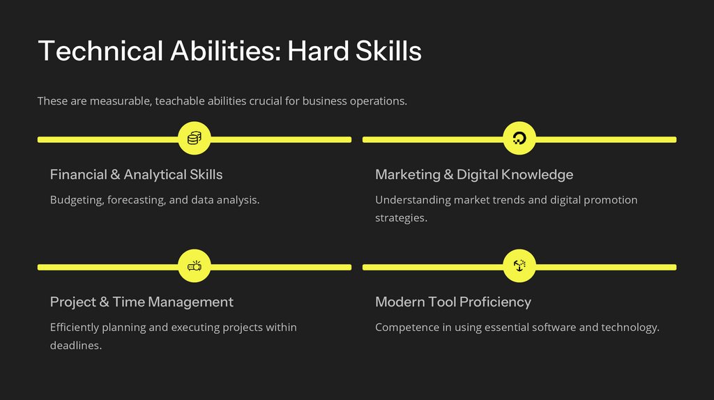 Technical Abilities: Hard SkillsThese are measurable, teachable abilities crucial for business operations.