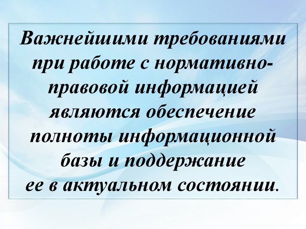 Важнейшими требованиямипри работе с нормативноправовой информацией