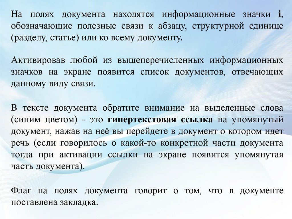 На полях документа находятся информационные значки i,обозначающие полезные связи к абзацу, структурной единице