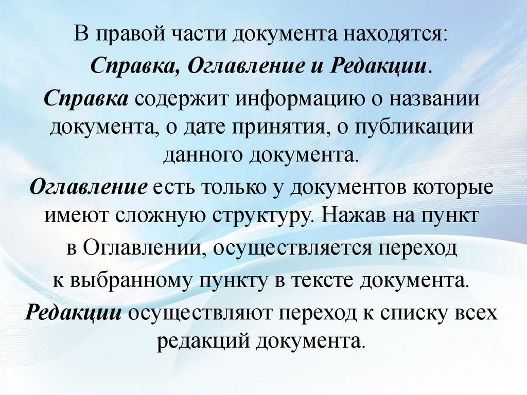 В правой части документа находятся:Справка, Оглавление и Редакции.