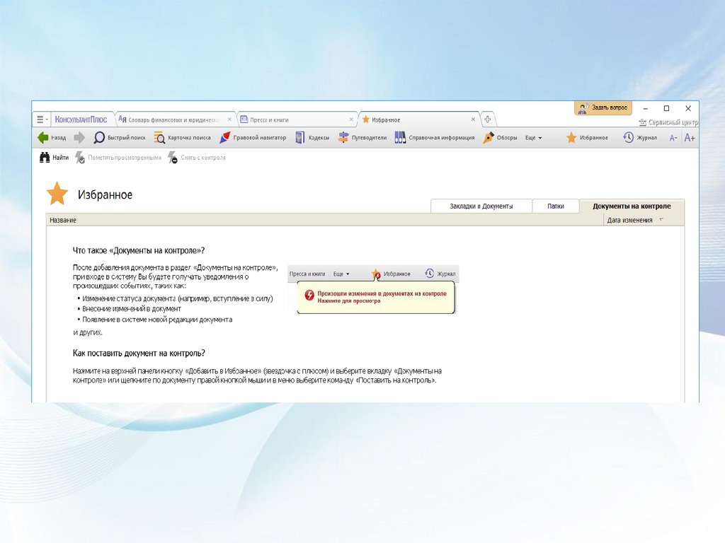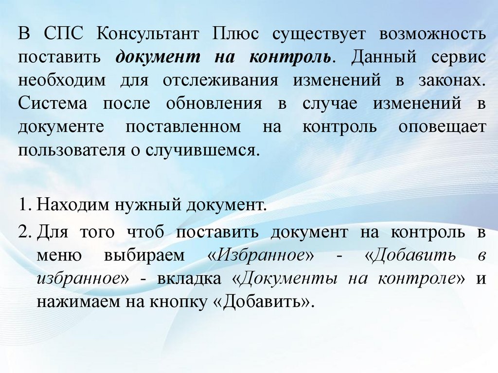 В СПС Консультант Плюс существует возможностьпоставить документ на контроль. Данный сервис