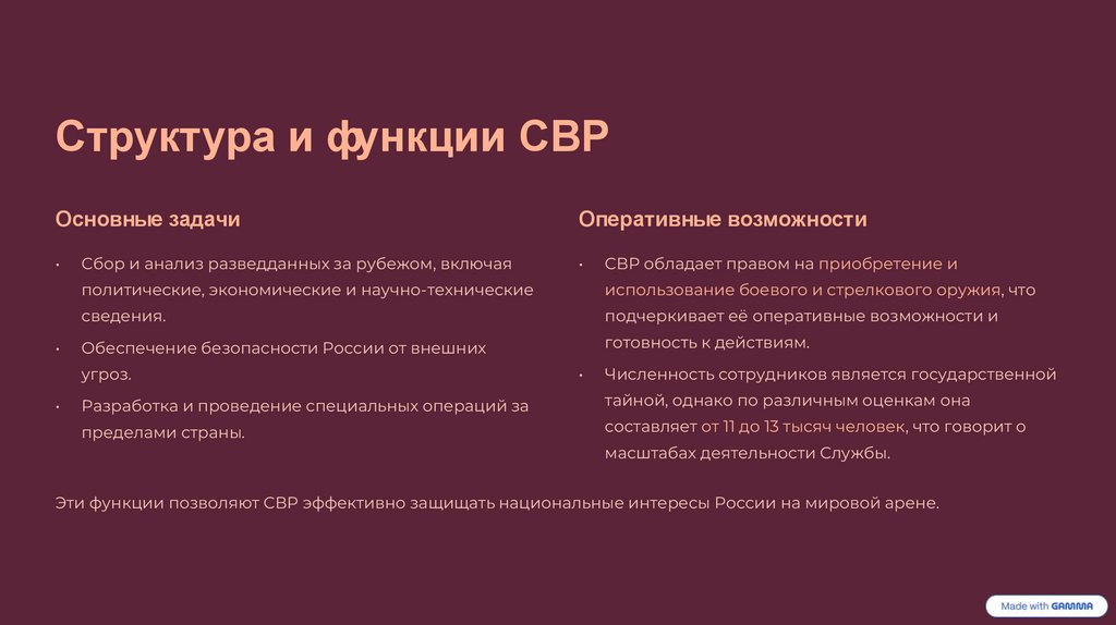 Эти функции позволяют СВР эффективно защищать национальные интересы России на мировой арене.
