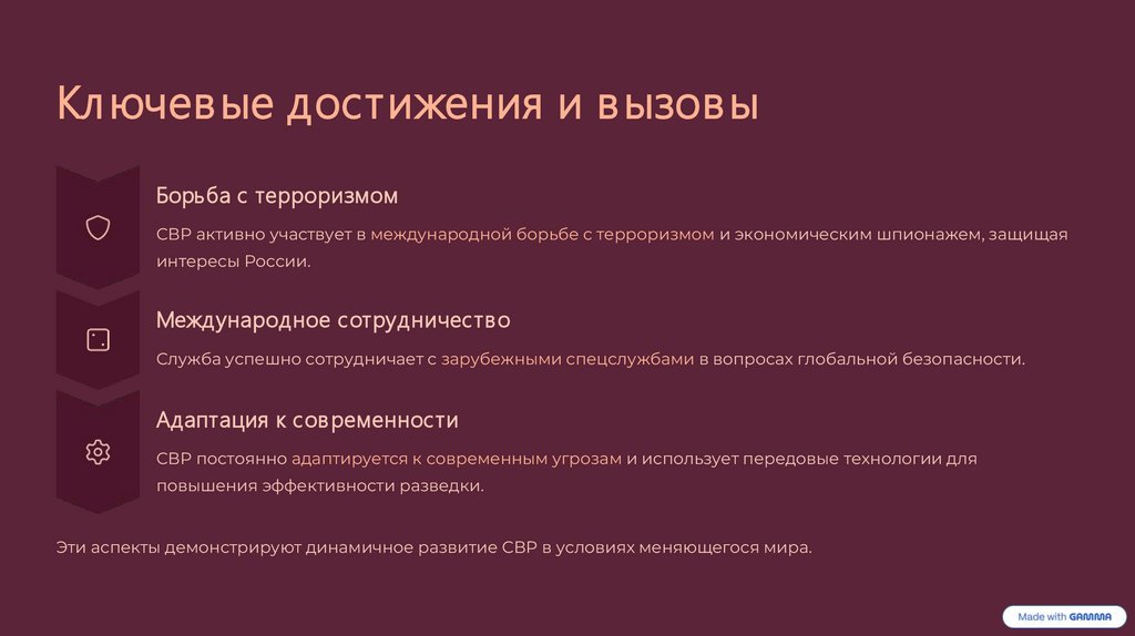 Эти аспекты демонстрируют динамичное развитие СВР в условиях меняющегося мира.