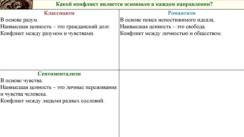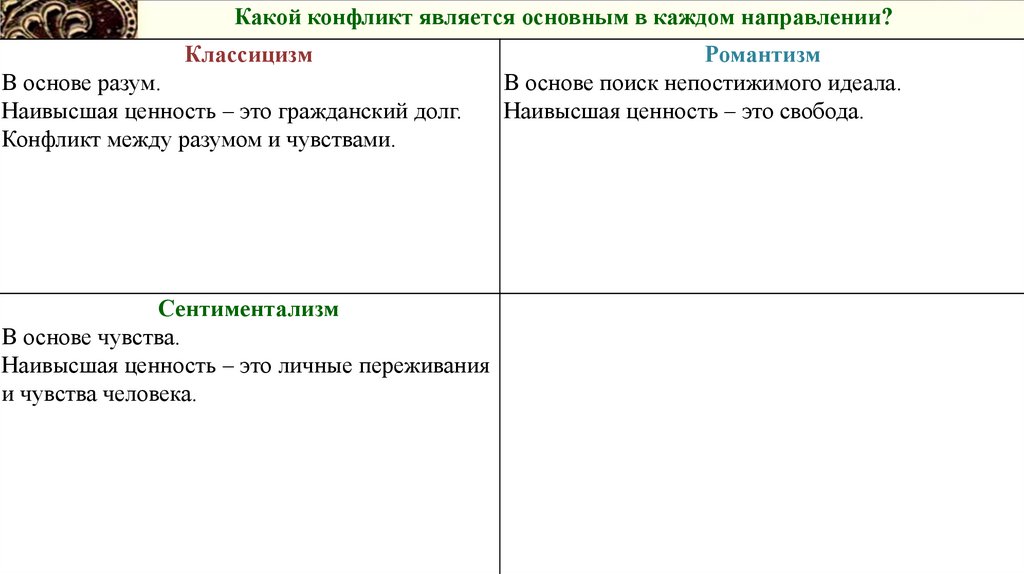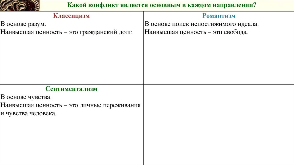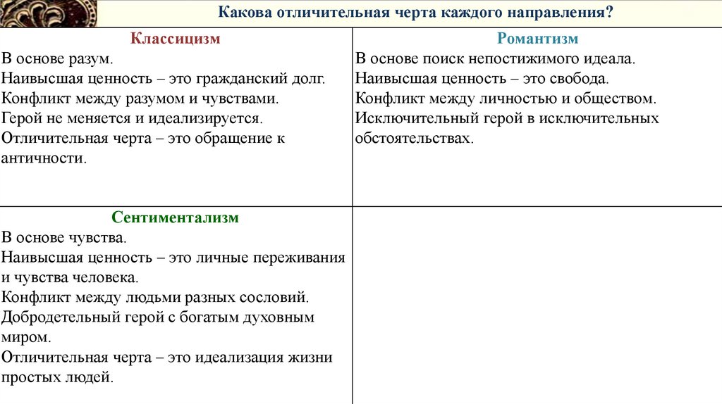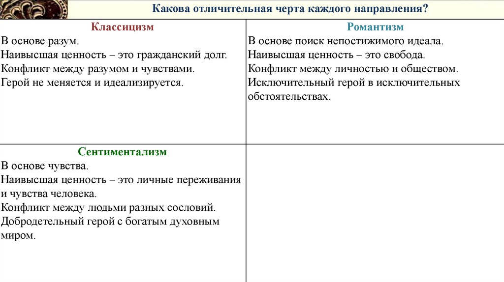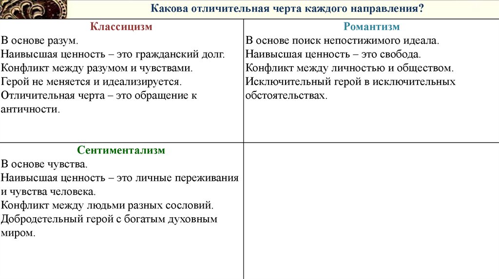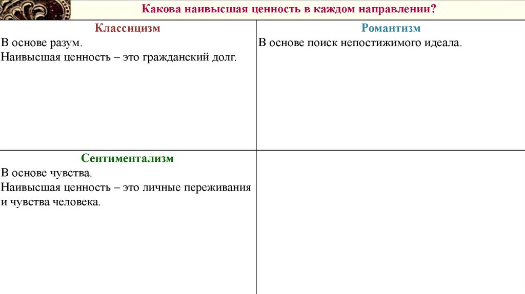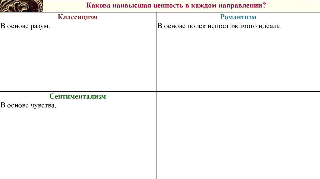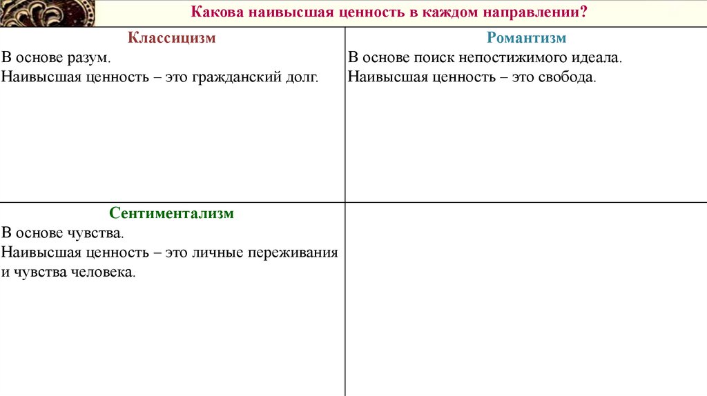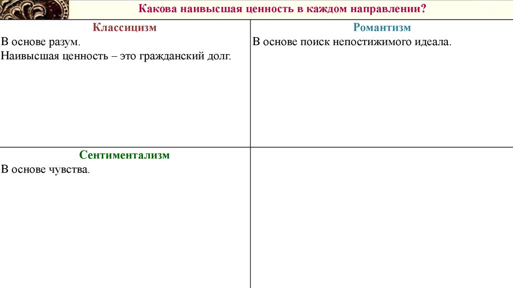 Какова наивысшая ценность в каждом направлении?Классицизм
