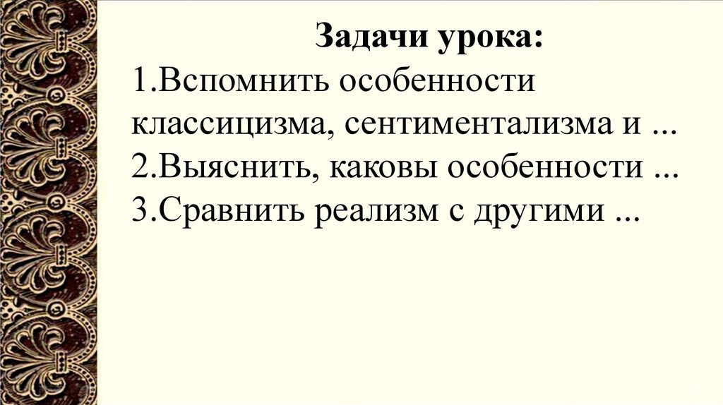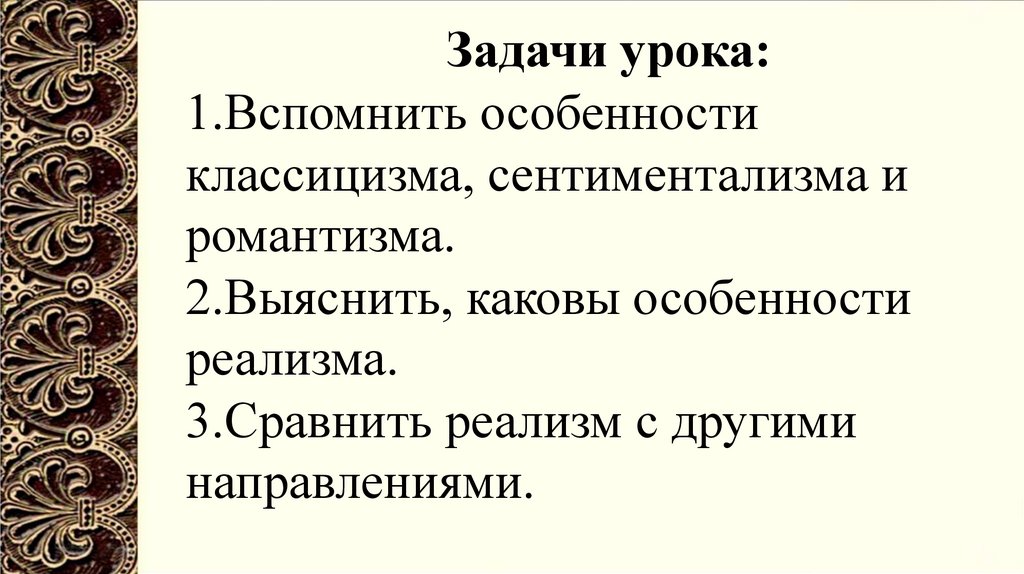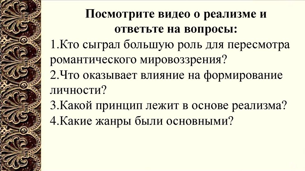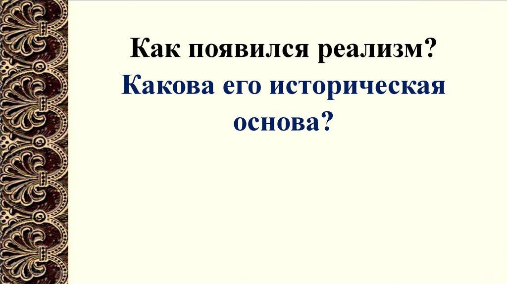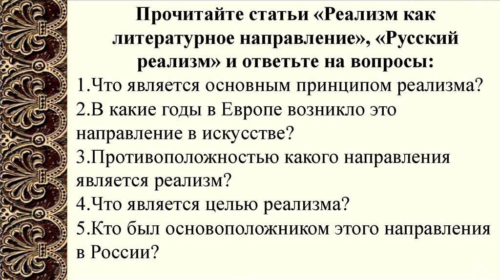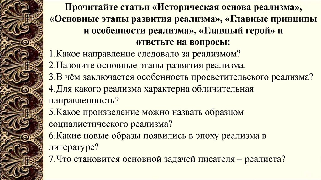 Прочитайте статьи «Историческая основа реализма»,«Основные этапы развития реализма», «Главные принципы