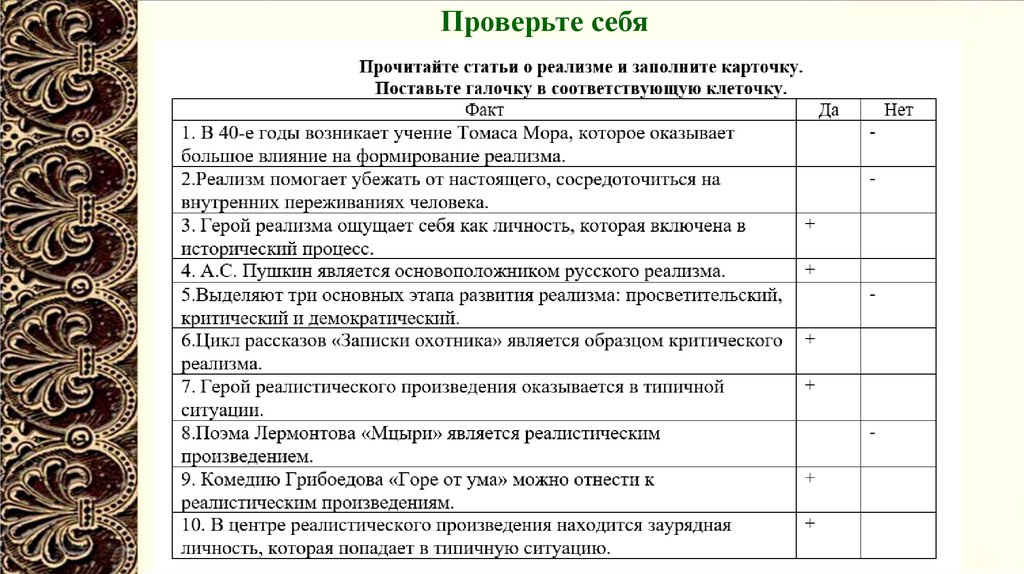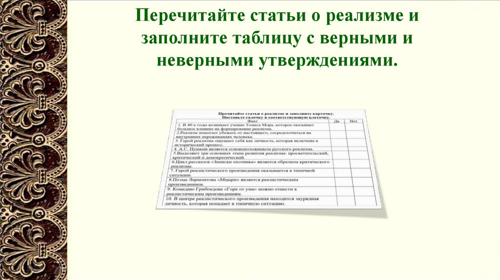 Перечитайте статьи о реализме изаполните таблицу с верными и