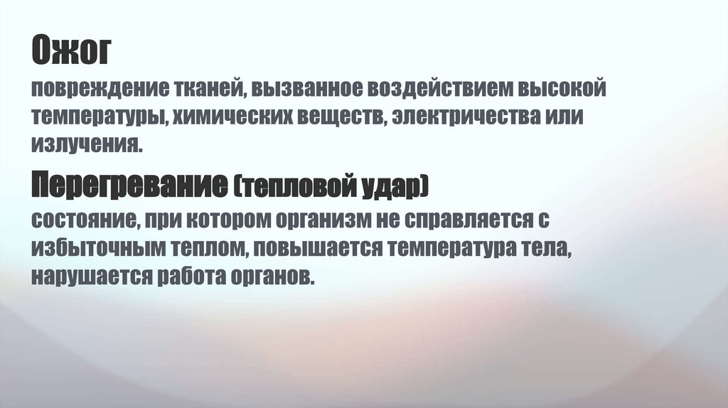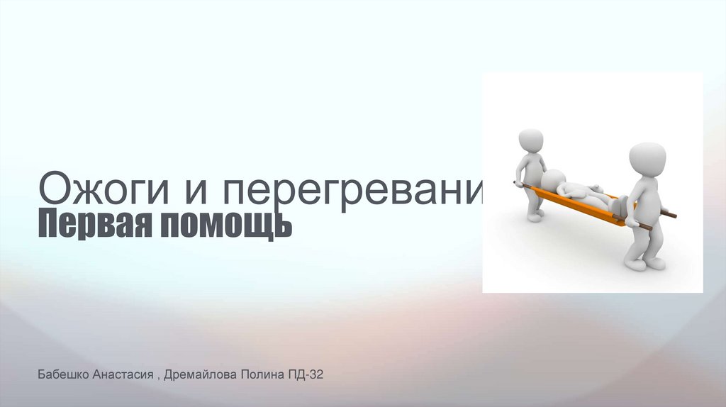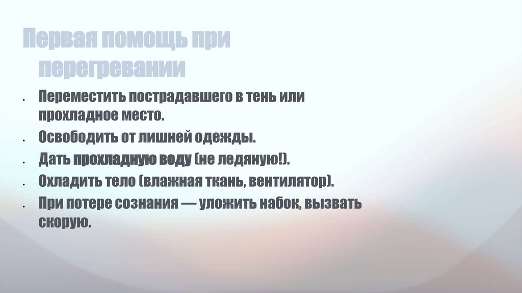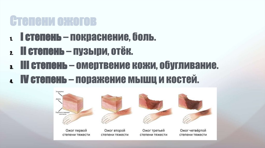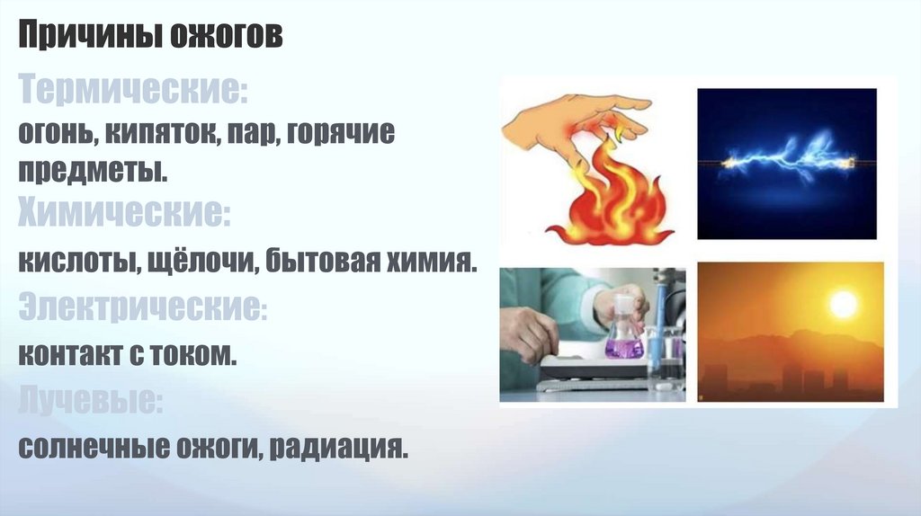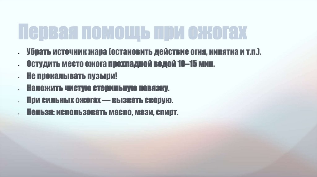 Первая помощь при ожогахУбрать источник жара (остановить действие огня, кипятка и т.п.).