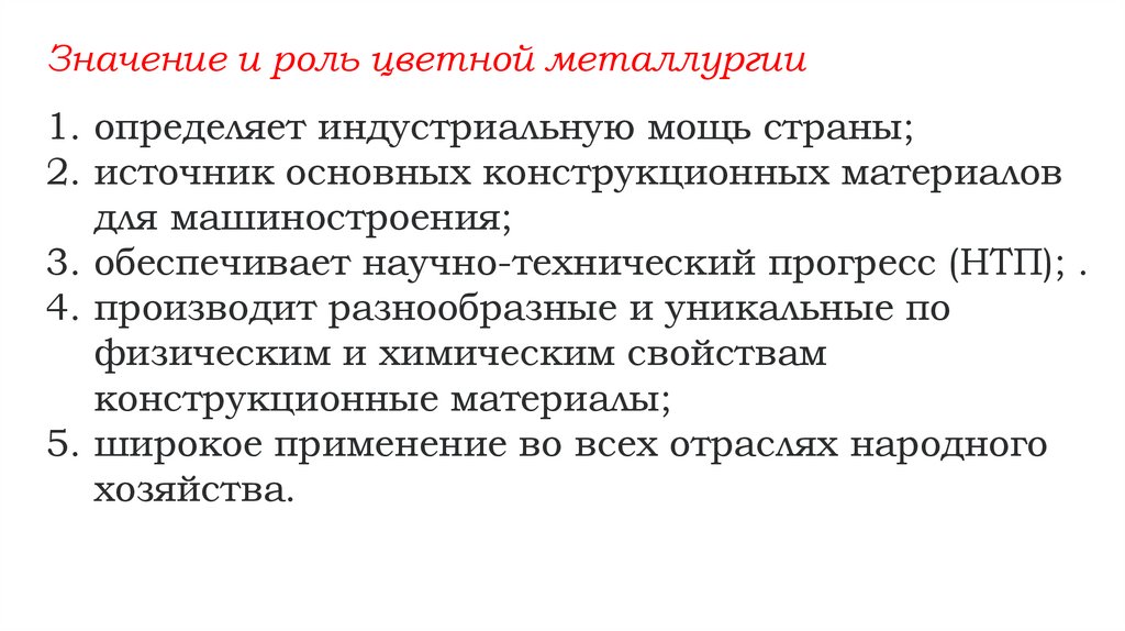 Значение и роль цветной металлургии1. определяет индустриальную мощь страны;
