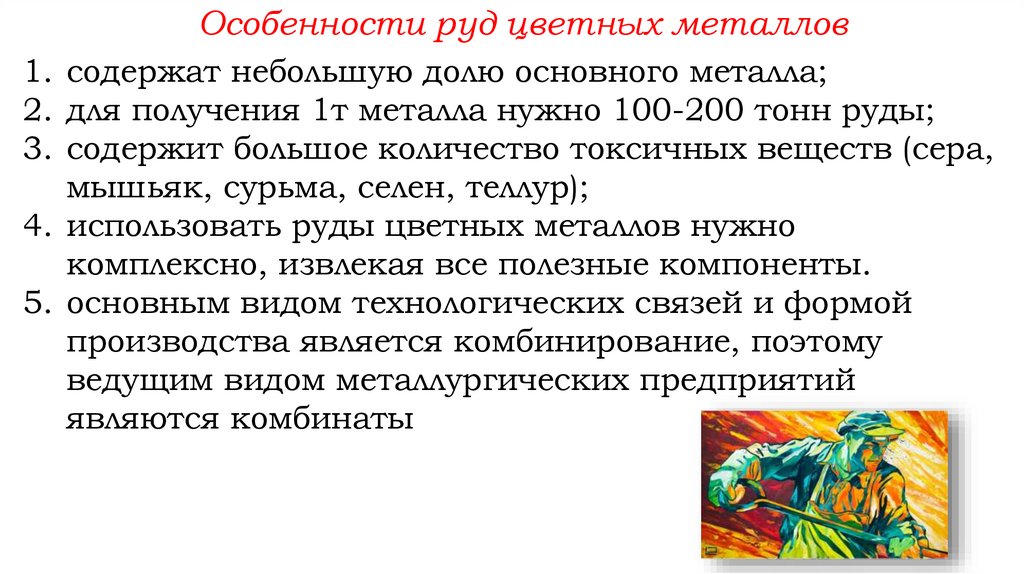 Особенности руд цветных металлов1. содержат небольшую долю основного металла;