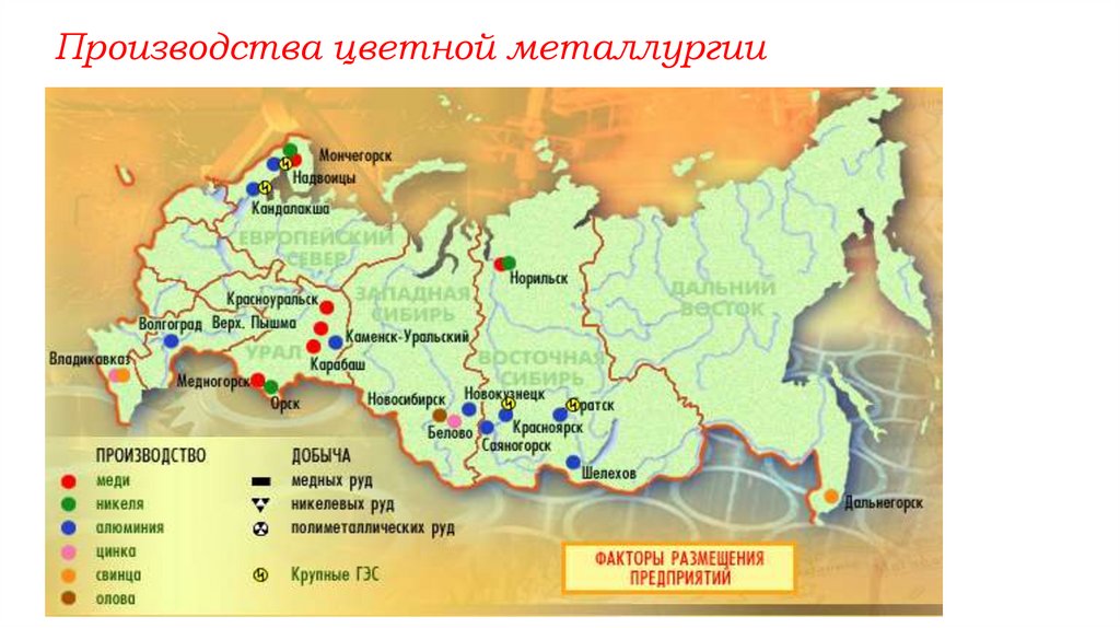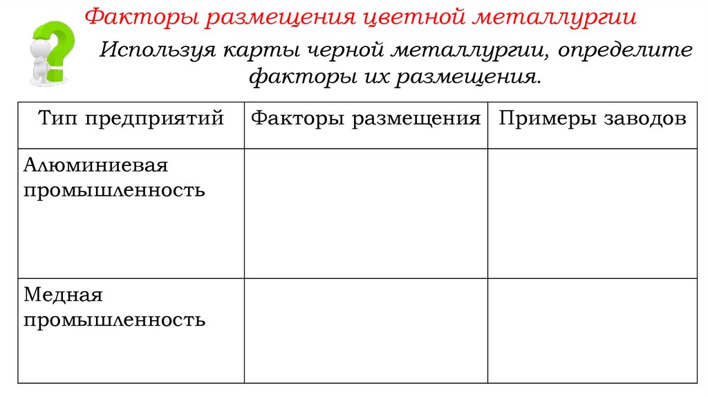 Факторы размещения цветной металлургииИспользуя карты черной металлургии, определите