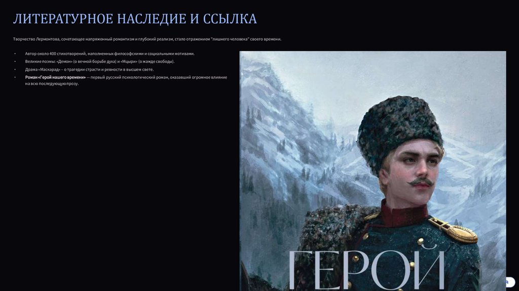 ЛИТЕРАТУРНОЕ НАСЛЕДИЕ И ССЫЛКАТворчество Лермонтова, сочетающее напряженный романтизм и глубокий реализм, стало отражением "лишнего человека" своего времени.