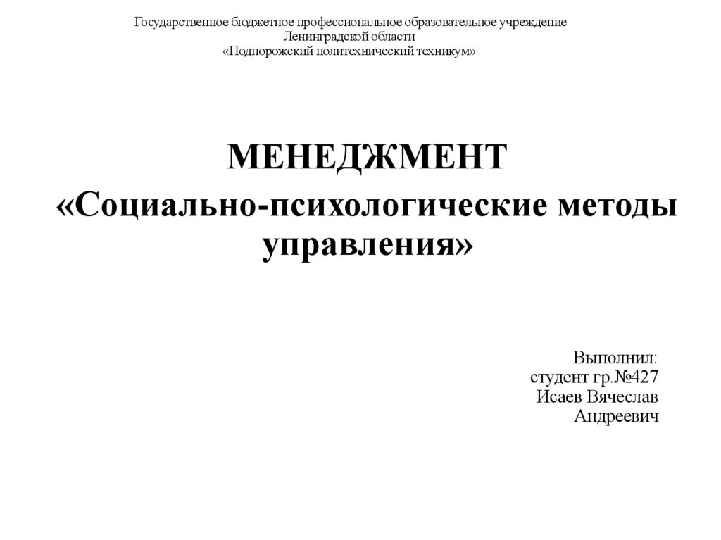 Основаны на использовании социального механизма управления (системавзаимоотношений в коллективе, социальные потребности и т.п.).