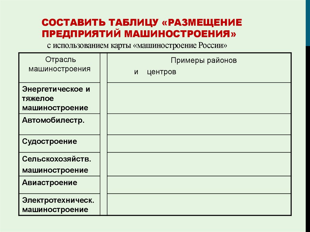 1. Составить таблицу «Размещение предприятий машиностроения» с использованием карты «машиностроение России»