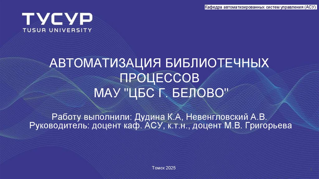 Кафедра автоматизированных систем управления (АСУ)АВТОМАТИЗАЦИЯ БИБЛИОТЕЧНЫХ