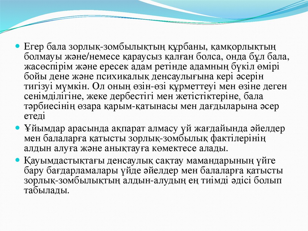 22. Балаларға зорлық-зомбылық жасау қаупін азайтуға мүмкіндік беретін факторлар