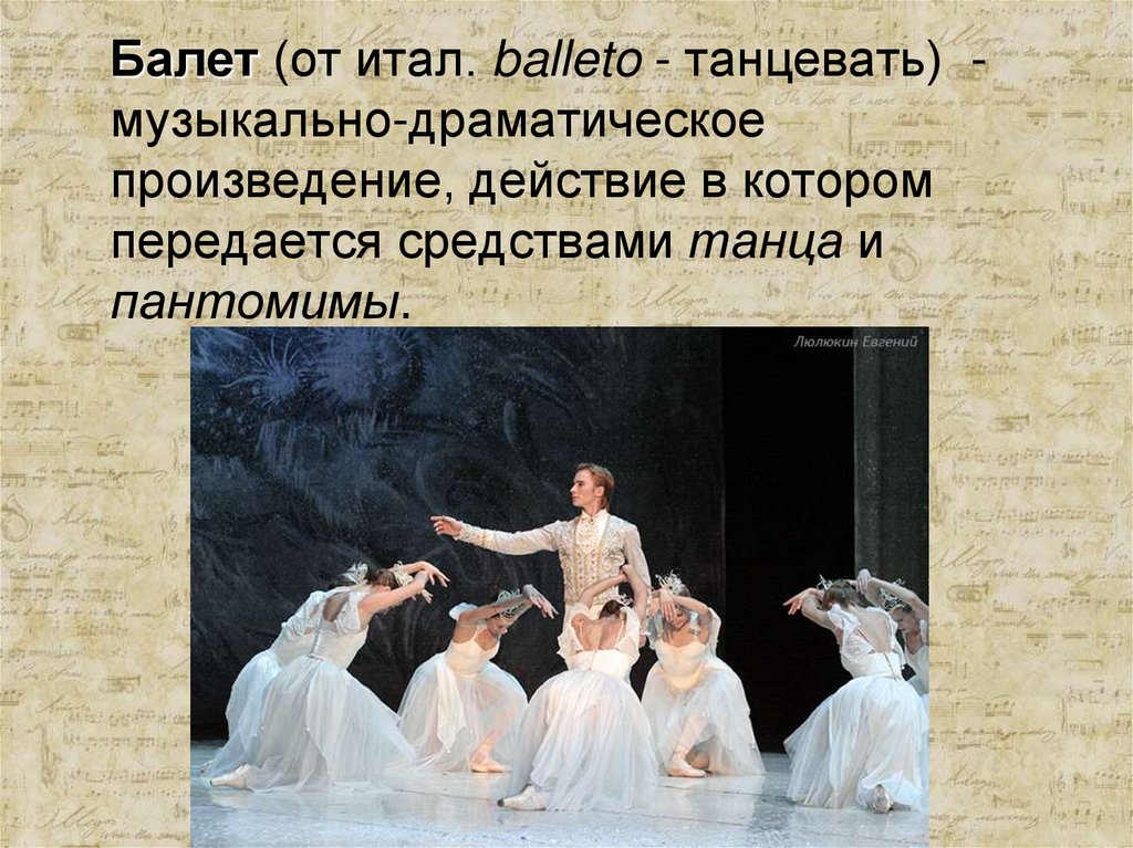 Балет (от итал. balleto - танцевать) музыкально-драматическоепроизведение, действие в котором