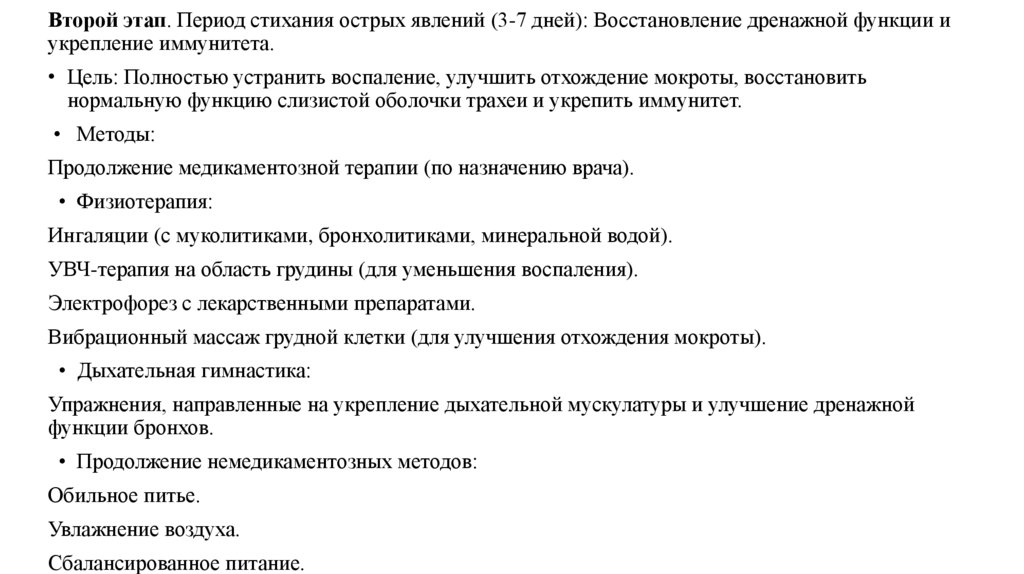 • Цель: Полностью устранить воспаление, улучшить отхождение мокроты, восстановить