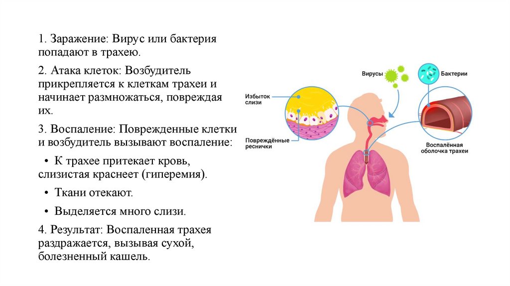 1. Заражение: Вирус или бактерияпопадают в трахею.