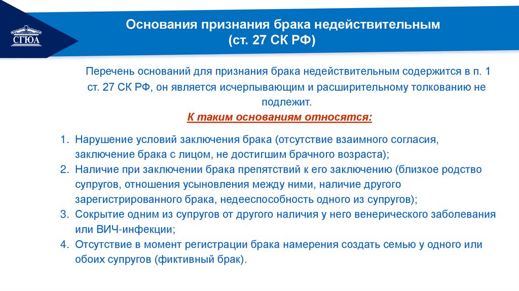 1. Нарушение условий заключения брака (отсутствие взаимного согласия,