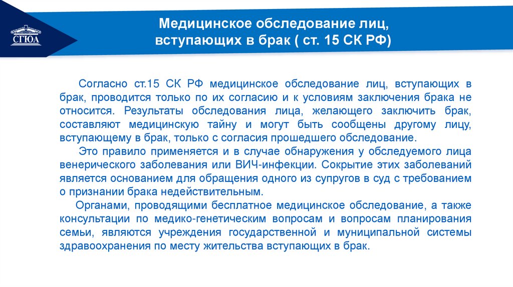 Согласно ст.15 СК РФ медицинское обследование лиц, вступающих в
