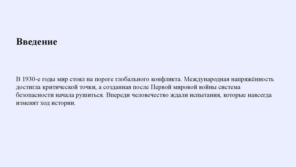 ВведениеВ 1930-е годы мир стоял на пороге глобального конфликта. Международная напряжённость