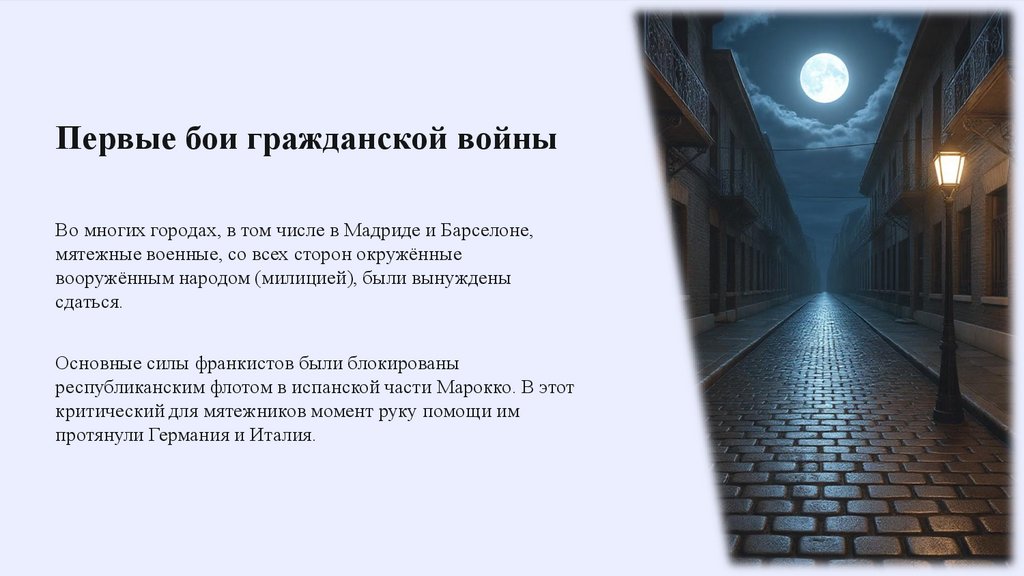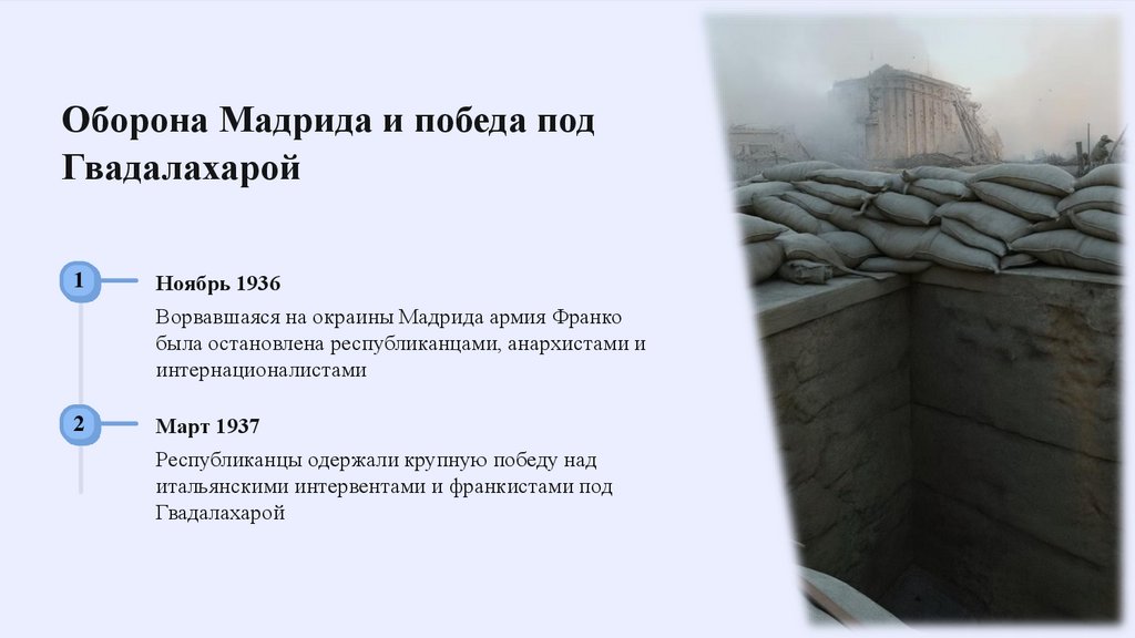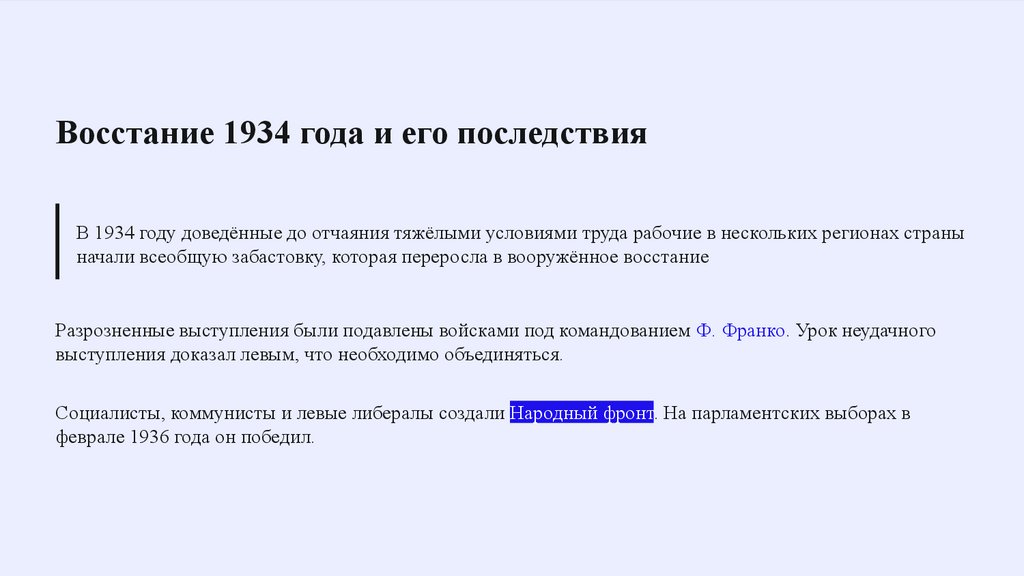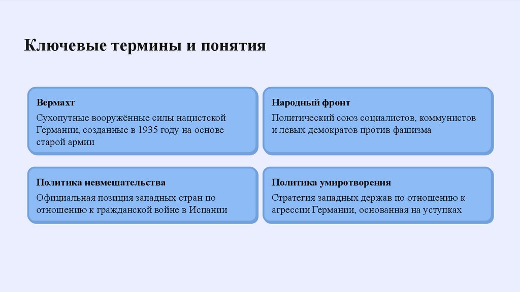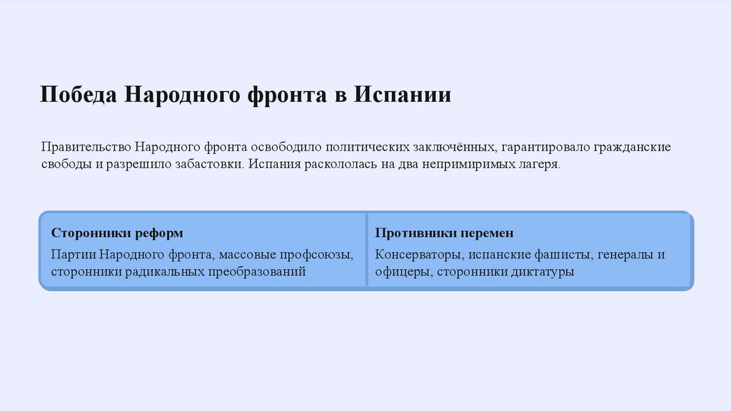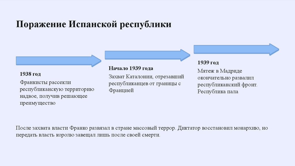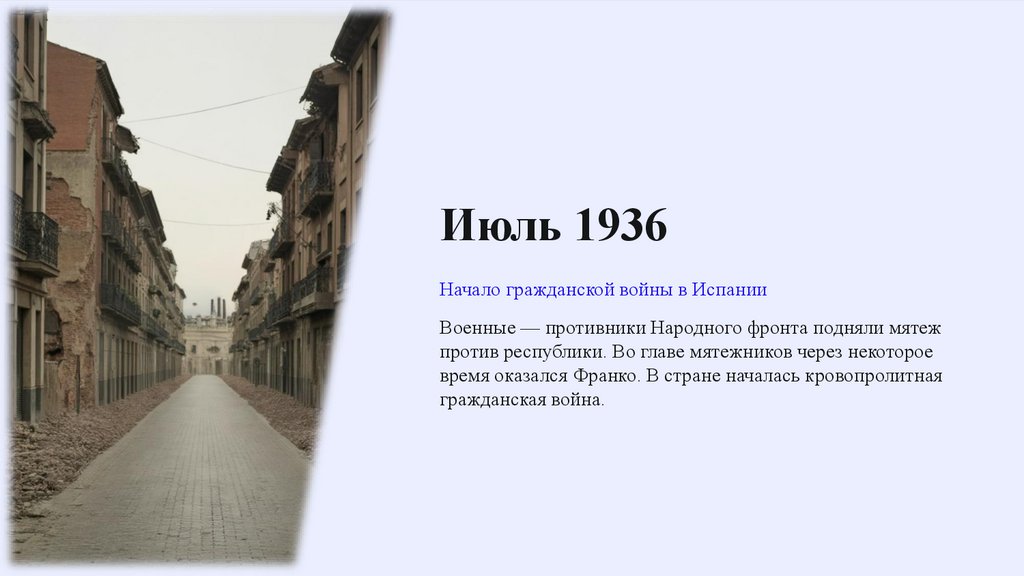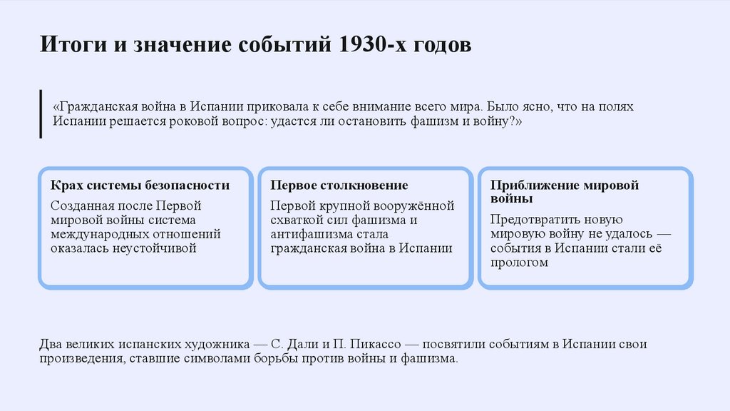 Итоги и значение событий 1930-х годов«Гражданская война в Испании приковала к себе внимание всего мира. Было ясно, что на полях