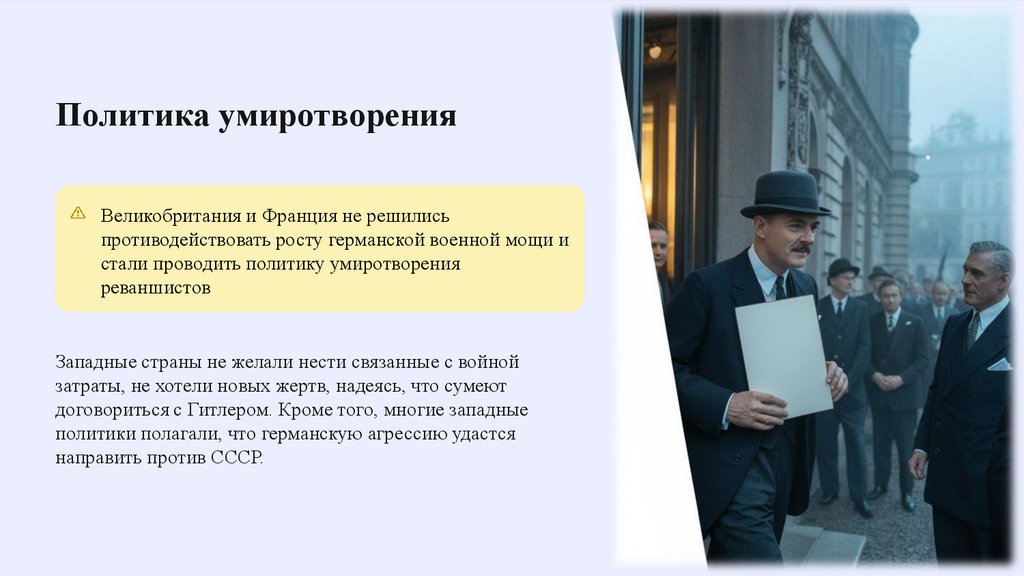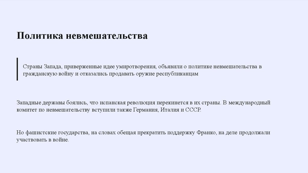 Политика невмешательстваСтраны Запада, приверженные идее умиротворения, объявили о политике невмешательства в