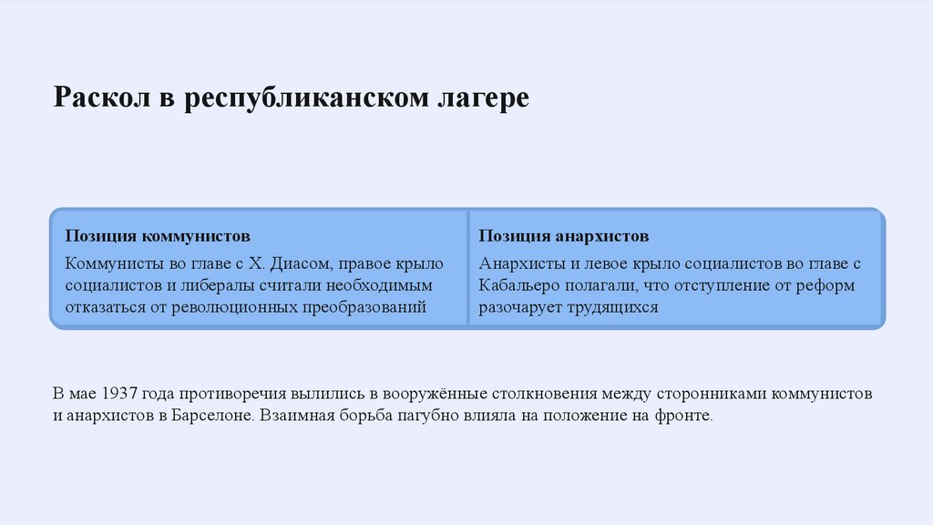 и анархистов в Барселоне. Взаимная борьба пагубно влияла на положение на фронте.