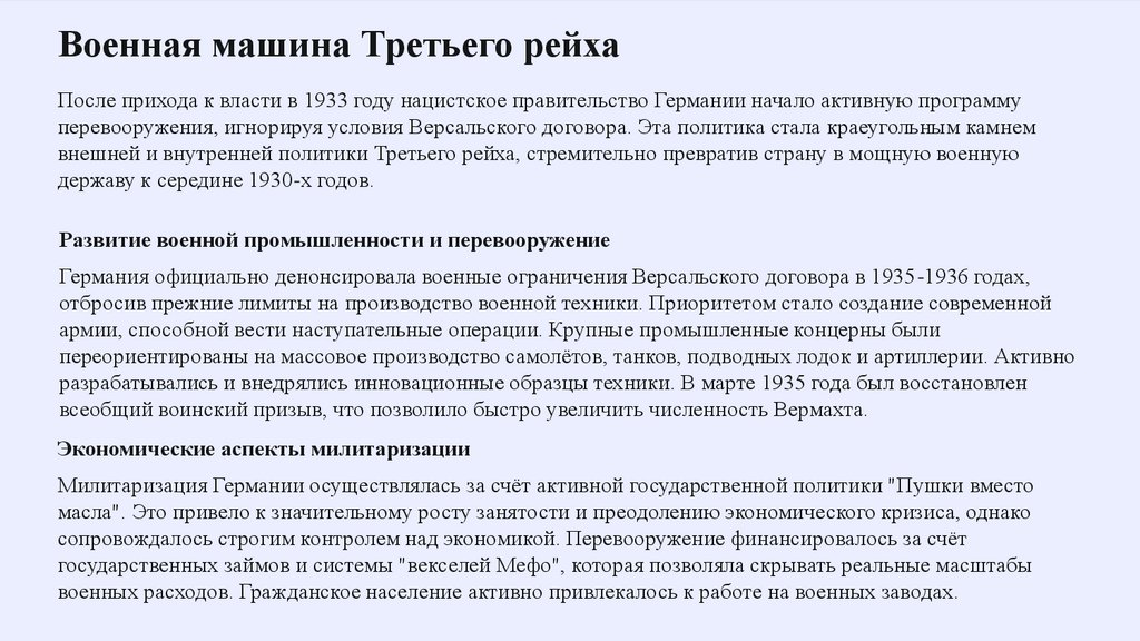 перевооружения, игнорируя условия Версальского договора. Эта политика стала краеугольным камнем