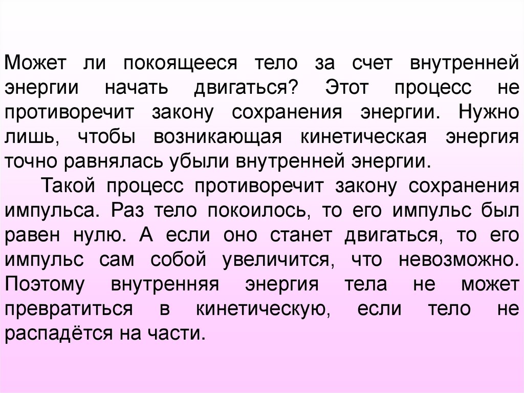 Может ли покоящееся тело за счет внутреннейэнергии начать двигаться? Этот процесс не